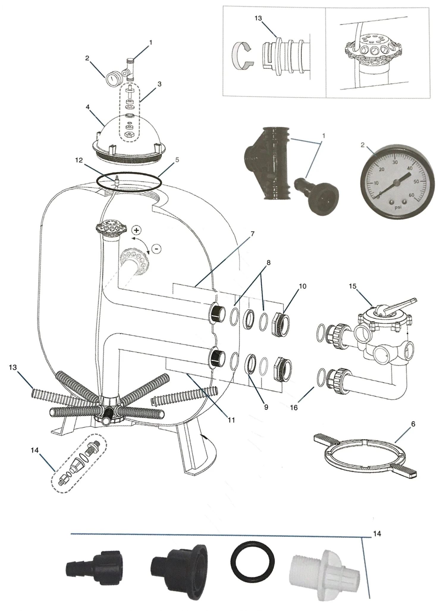 | Options | 1. Manual Plastic Air Bleed Valve, 2. Pressure Gauge 1/4" Back Mount, 3. Lid to Gauge Adaptor Assembly (Brass), 4. Triton 8.5" Domed Lid, 5. Triton 8.5" Domed Lid O-Ring, 6. Triton Lid Tool 8.5" lid, 7. Top Diffuser System 19", 7. Top Diffuser System 24", 7. Top Diffuser System 30", 7. Top Diffuser System 36", 8. Bulkhead O Ring (x2), 9. External Adjusting Ring 19" & 24", 10. Bulkhead Nut (To Adjust & Connect MPV (x2), 11. Bottom Diffuser System 19", 11. Bottom Diffuser System 24", 11. Bottom Diffuser System 30", 11. Bottom Diffuser System 36", 11. Bottom Diffuser System 19" Clearpro, 11. Bottom Diffuser System 24" Clearpro, 11. Bottom Diffuser System 30" Clearpro, 11. Bottom Diffuser System 36" Clearpro, 12. Filter Air Tube Strainer, 13. Pentair Lateral 19", 13. Pentair Lateral 24", 13. Pentair Lateral 30", 13. Pentair Lateral 36", 13. Pentair Lateral 19" Clearpro, 13. Pentair Lateral 24" Clearpro, 13. Pentair Lateral 30" Clearpro, 13. Pentair Lateral 36" Clearpro, 14. Drain Kit, 2" O Ring (pack of 10), Base (19 &24"), Base (30 & 36"), 1.5" Valve Stem/Rotor (w/Gasket), 2" Valve Stem/Rotor (w/Gasket), 1.5" Spider Gasket (19 – 24" Filter) Pre 2007, 2" Spider Gasket/Rotor (30" Filter) Pre 2007, Starite 2" Valve Rotor (NO GASKET), Lid O-Ring 6", 15 Valve 1.5" 6-Way (19" & 24"), 15 Valve 2" 6-Way (30" &36"), COVER O RING 1.5" VALVE (TRITON TR 60), GAUGE NUT WITH O RING (TRITON TR60) |