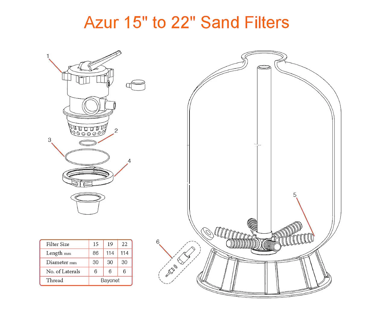 | Options | 1. Valve 1.5" 6-Way (19" & 24"), 2. Centre Pipe O-Ring, 3. Valve O-Ring, 4. Valve Clamp 19" & 22", 5. Lateral 15" & 19", 5. Lateral 22", 6. Drain Assembly, Pressure Gauge 0.25", Pump Connecting Hose for 15", Pump Connecting Hose for 19", 1.5" Valve Stem/Rotor with Gasket – Post 2007, 1.5" Spider Gasket (19"-24" filter) Pre 2007 |