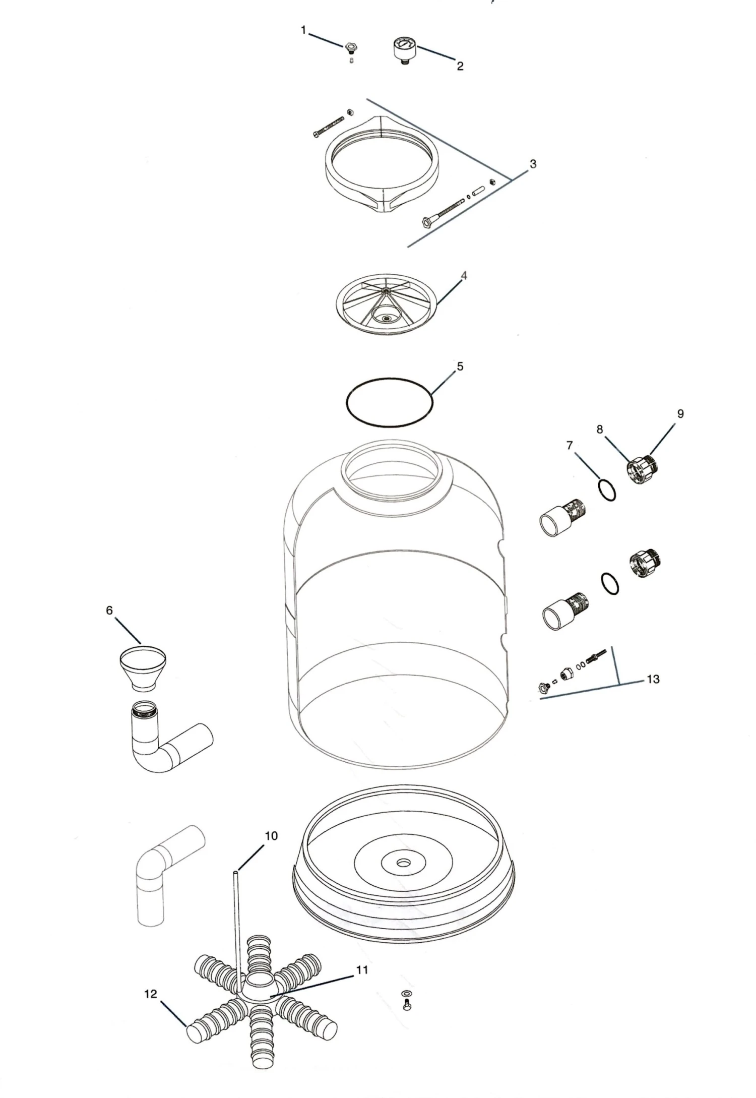 | Options | 2. Pressure Gauge 1/8" Back Mount, 3. Neck Lock/Clamp Kit, 5. Lid O-Ring, 6. Diffuser D50, 6. Diffuser D63-75, 7. Bulkhead O-Ring 60 x 8, 8. 1.5" Bulkhead Fitting, 8. 2" Bulkhead Fitting, 9. Bulkhead/MPV O-Ring, 11. Lateral Collector Unit (8 slots), 12. Lateral 20" (110mm), 12. Lateral 24" (175mm), 12. Lateral 30" (225mm), 13. Drain Assembly, 1.5" Spider Gasket, 2" Spider Gasket, 1.5" Multiport Valve, Rotor for 2" multiport valve, Purge cover alternative for (1) |