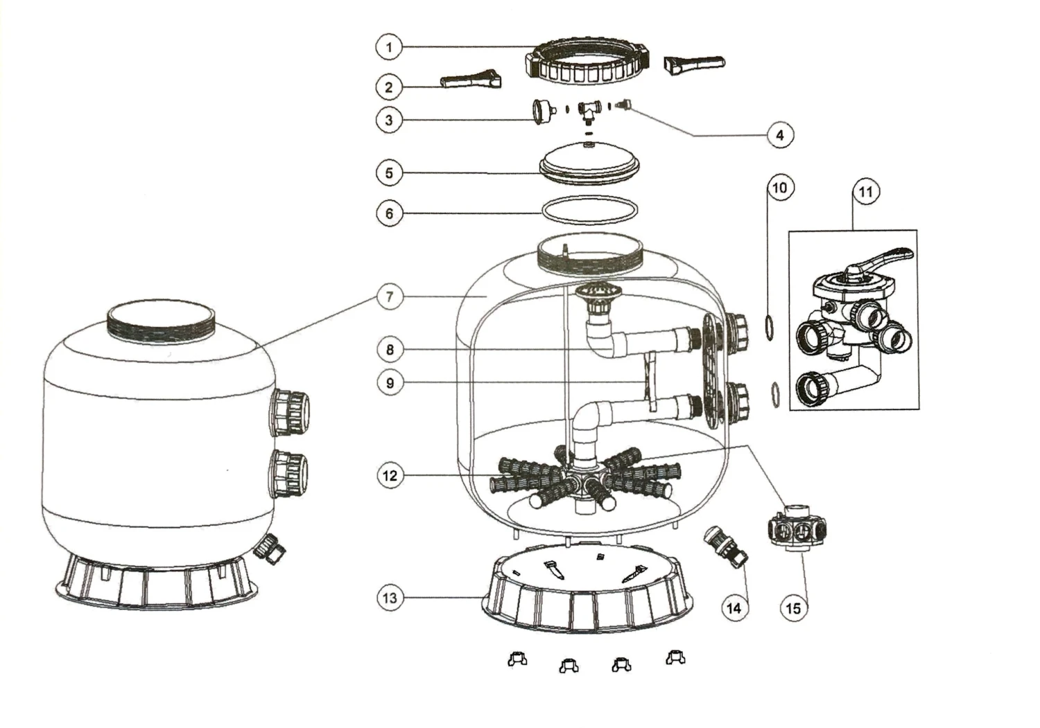 | Options | 1. Endurance ringlock nut, 2. Endurance ringlock spanner, 4. Endurance T-shape Bleed Valve, 5. Endurance Lid, 6. Endurance Lid O-Ring, 8. Endurance Inner Tank System 18", 8. Endurance Inner Tank System 21", 8. Endurance Inner Tank System 25", 9. Endurance 1.5" Tank System Support, 10. Endurance O-Ring for 1.5" Adaptor, 11. Endurance 1.5" Multiport (black) for 18", 21", 25", 12. Endurance Laterals (115mm), 12. Endurance Laterals (126mm), 13. Endurance Filter Base 18"-21", 13. Endurance Filter Base 21"-28", 14. Endurance Water Drain Set, 15. Endurance Lateral Assembly Hub |