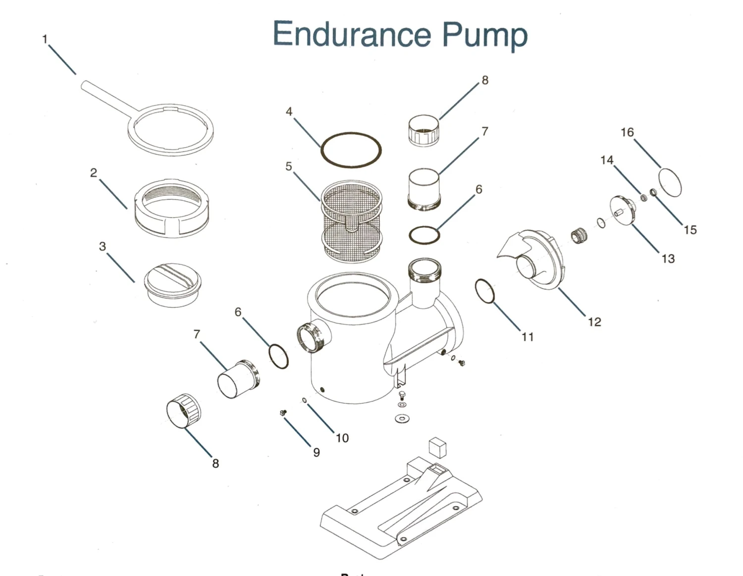 | Options | 1. Lid Nut Spanner, 2. Lid Nut, 3. Lid, 4. Lid O-Ring, 5. Basket, 6. Link O-Ring (pack of 2), 7. Union 0.5 – 1hp (pack of 2), 7. Union 1.5hp (pack of 2), 8. Union Nut 2" (pack of 2), 9. Drain Plug 0.25" (pack of 2), 10. Drain Plug O-Ring (pack of 2), 11. Diffuser O-Ring, 12. Diffuser 0.5-0.75hp, 12. Diffuser 1-2hp, 13. Impeller 0.5hp, 13. Impeller 0.75hp, 13. Impeller 1hp, 13. Impeller 1.5hp, 14. Distancing Washer, 15. Mechanical Seal, 16. Motor Bridle O-Ring, Capacitor 12µF 0.5hp, Capacitor 20µF 0.75, 1, 1.5hp, Fan for 0.5-1hp, Fan Cover for 0.5-1hp, Fan for 1.5-2hp, Fan Cover for 1.5-2hp |
