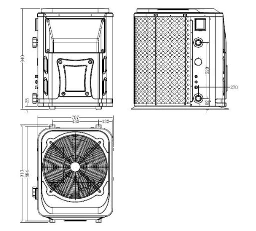 Swimming Pool Heat Pump Hydro Pro type 18, vertical. “All seasons” model, will heat or cool the pool water maintaining a constant temperature when the air ambient temperature is -5 to 43 °C.  With automatic defrost function, drain and flow switch. Durable, PVC & Titanium tube which can withstand prolonged exposure to swimming pool water and cabinet made from corrosion resistant ABS. Quiet running with low sound rotary compressor and low noise fan. Easy to operate digital temperature control with LCD display and micro-computer controlling, allowing all operation parameters to be set. Essentially working like an air conditioning unit but in reverse, the heat pump uses the ambient air temperature to excite a refrigerant enclosed within the unit. The temperature of the refrigerant is raised thus generating heat in the process. By diverting the flow from your pool recirculation pump and sand filter system, the circulating water collects the heat generated by the ‘excited’ refrigerant. As long as the unit is switched on heat will be provided all year round to the temperature you set. Desired water temperature is 27 – 28 °C (a larger heat pump is recommended to reach a higher water temperature). The heating capacity of the heat pump depends on the environmental – outside air – temperature, water quantity, but also position of the pool and heat pump and the degree of isolation for each. For best results a pool cover should be used, as ~80% of heat is lost over night through the evaporation process. Also, a bypass kit should be used with every heat pump (not included). The Bypass kit disengages the water flow to the pump so the swimming pool water is still flowing but does not flow through the heat pump. This is necessary when cleaning the swimming pool using chemical products. Will allow winterising the heat pump without affecting the water flow to the swimming pool. This unit is designed be installed outdoors or indoors.  Please consult a qualified electrician for installation. It is recommended to connect the heat pump to a dedicated AC power supply branch circuit equipped with the proper circuit breaker, disconnect or time delay fuse protection. Maximum pool volume depending on environmental conditions.  Accessories included: 4 x Anti-vibration base, 2 x Draining jet, 1 x Waterproof box, 1 x 10m Signal wire, 2 x Water drainage pipes, 1 x winter cover. Dimensions: 36″ L x 28″ W x 37″ H (91cm x 70.7cm x 94cm). Please see “More Information” section for technical specifications. Collection at our store only, please contact us.