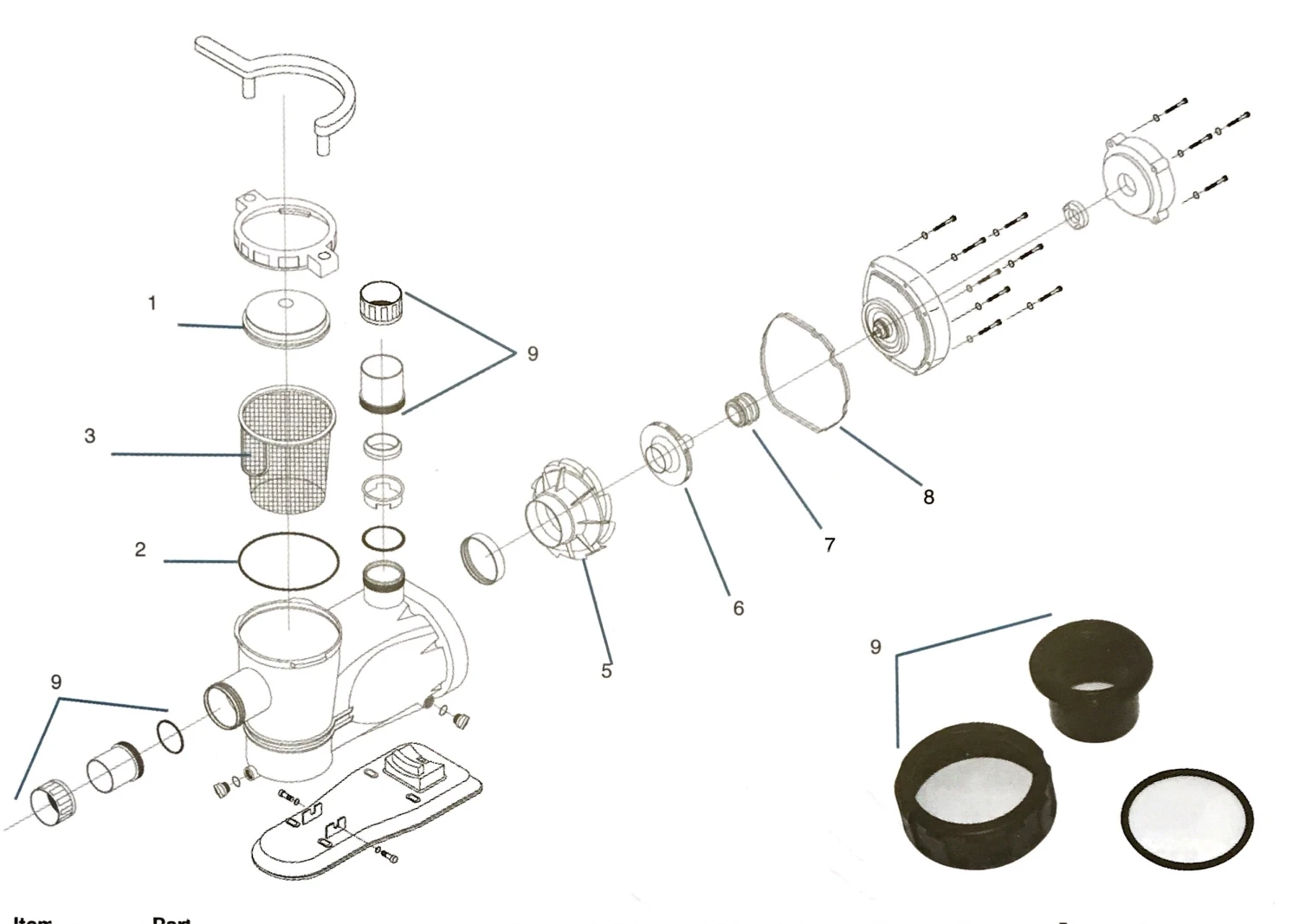 | Options | 1. Lid, 2. Lid O-Ring, 3. Basket, Diffuser Seal, 5. Diffuser, 6. Impeller 0.75hp, 6. Impeller 1hp, 6. Impeller 1.5hp, 7. Mechanical Seal, 8. Volute Gasket, 9. Union Assembly, Capacitor for 16µF 1.5hp, Capacitor for 12µF 0.75hp, Capacitor for 12µF 1hp, 50mm-1.5" Reducer required for SFP009 for 1.5" pipe, Lid Handle, iFlo Drain Plug, IFLO PUMP RELACEMENT BODY |