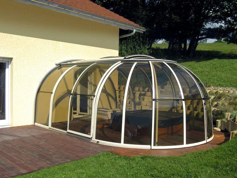 This version can be used not only as a spa enclosure, but also as a winter garden. It can also be used as a gazebo structure to enjoy pleasant moments in your garden. The enclosure‘s roof can be partially opened, and the model has one to two doors. The version with smoked polycarbonate glazing protects from sunlight and thus naturally regulates the temperature within.