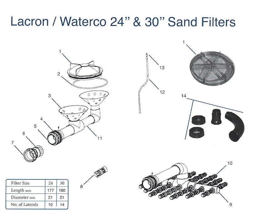 | Options | 2" Pipework Kit (Gasket) (30") Post 2004, 1. 8" Lid*, 2. Lid O-Ring, 3. Rose Distributor, 4. 1.5" Bulkhead Fitting Gasket (pack of 2), 4. 2" Bulkhead Fitting Gasket (pack of 2), 5. 1.5" Bulkhead Fitting with Nut, 5. 2" Bulkhead Fitting w/Nut, 6. 1.5" Union Adaptor Gaskets (pack of 2), 6. 2" Union Adaptor Gasket (Pk 2), 7. 1.5" Union Adaptor Nut & Sleeve (Pk 2), 7. 2" Union Adaptor Nut & Sleeve (Pk 2), 8. Drain Plug Assembly, 9. 1.5" Underdrain Pipe (24") Less Laterals, 9. 2" Underdrain Pipe Assembly (30") Less Laterals, 10. Lateral Set (24"), 10. Lateral Set (30"), 11. 1.5" Header Pipe (24") (Less Rose), 11. 2" Header Pipe (30") (Less Rose), 13. Air Bleed Cap, 12. Air Bleed Tube (cut to length on site), 14. 1.5" Pipework Kit (Gasket) Pre 2004 (18"/24"), 2" Face Pipework Kit (O-Ring), 1.5" Pipework Kit (O-Ring) Post 2004 (24"), Lid Tool (6"-8" Lids), Pressure Gauge 1/4", MPV 1.5" 6-Way (White) Pre 2004 (24"), MPV 1.5" 6-Way (Black) Post 2004 (24"), MPV 2" 6-way (White) (30"), MPV 2"/63mm 6-way (Black) Post 2004 (30"), 1.5" Spider Gasket (24" White MPV), 2" Spider Gasket (30" White MPV), 1.5" Spider Gasket (24" Black MPV), 2" Spider Gasket (30" Black MPV), MPV FOR SIDE MOUNT LSR 24" FILTER (WILKINSON) |
