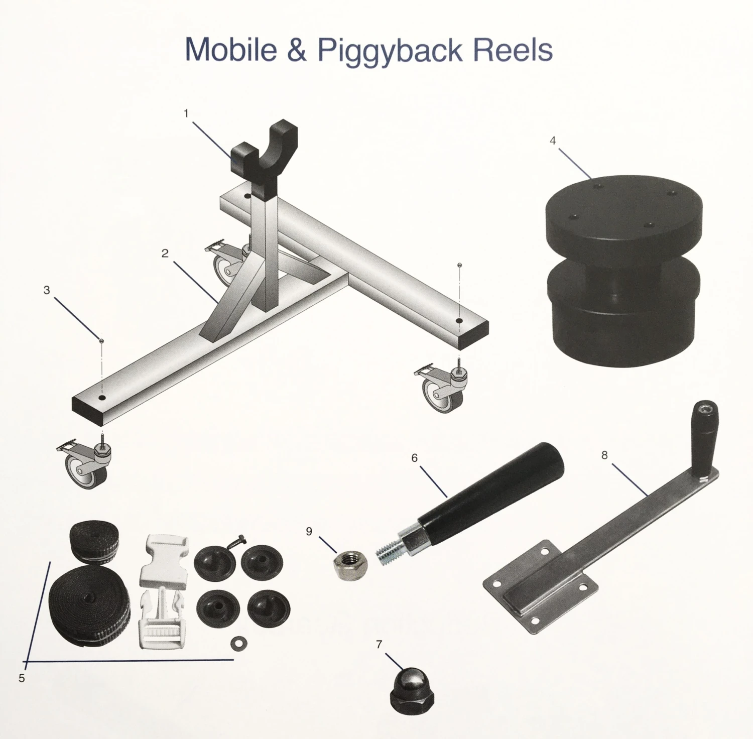 | Options | 1. Reel Support Y Piece, 2. End Stand Mobile (metalwork), 3. M12 Dome Nut, 4. End Boss, 5. 5ft Strap Kit Quick Release (Piggyback), 5. 7ft Strap Kit Quick Release (Piggyback), 6. Handle 80mm Long with Studding, 7. M10 Dome Nut, 8. Crank Handle Assembly, 9. M10 Stainless Steel Nyloc Nut, End Boss & Crank Assembly, M8 x 30 Bolt, End Stand Piggyback (metalwork), 5" Braked Castor, 5" Unbraked Castor, 6" Castor with brake (Piggyback) |