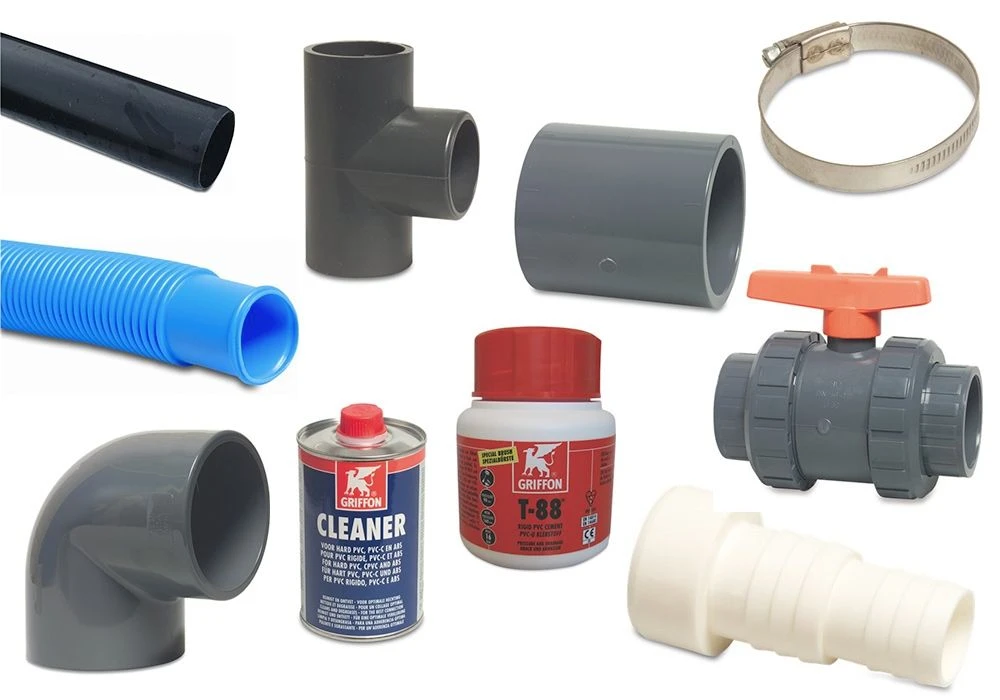 Hydro-Fit – Universal kit (Bypass Heat Pump). The Bypass kit disengages the water flow to the pump so the swimming pool water is still flowing but does not flow through the heat pump. This is necessary when cleaning the swimming pool using chemical products. Will allow winterising and maintaining your heat pump without affecting the water flow to your swimming pool. Also, if needed, it can isolate the heat pump from the pool pipework system. Will enable the pool heat pump to operate at its maximum efficiency. The Bypass Kit contains: 2 x PVC Elbow 90° 50mm 16bar, 2 x PVC T-Piece 50mm 16bar, 6 x PVC Tube 50mm 10cm 10bar, 2 x PVC Socket 50mm 16bar, 3 x PVC Ball valve 50 mm 16bar, 6 x SS Hose clamp 32 x 44 mm, 6 x ABS Hose tail white 50 x 32 mm / 38mm, 2 x Pool hose 38mm blue with double cuffs 1.5 mtr, 1 x Griffon PVC glue, type T-88 0.1L, 1 x Griffon Cleaner 125ml.
