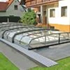 ENDLESS SUMMER enclosures can be opened for their entire length on all sides of the pool with upwards sliding doors – that are easy to handle –as well as with special end sections. When the structure is in an open position, only the enclosure supports remain on the ground, spaced every 2.1 m. Therefore, no thresholds or rails obstruct traffic going in and out of the pool. This structural solution makes ENDLESS SUMMER enclosures aesthetically elegant and graceful.
