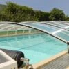 This is a high level sliding enclosure that allows the pool to be used whilst in the closed position. Its swept curved section gives it an aesthetically pleasing look. The end walls can be equipped with outward opening or sliding doors.